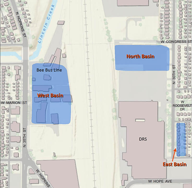 The project would be built in two phases. The goals of the first phase were the construction of the North and East Basins located east of the CP Rail Corridor along North 31st Street. The North and East Basins are providing an interim improvement in stormwater flood management until the West Basin (Phase 2) is completed.